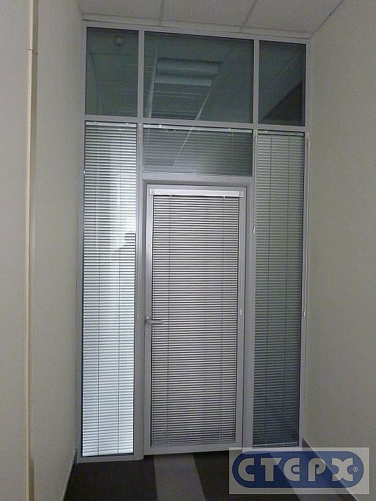 Офисная перегородка с дверью и с встроенными горизонтальными жалюзи. Вся конструкция выполнена в едином цвете «серый металлик»