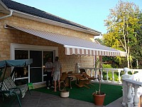 Выдвижная маркиза «Атлет-Гранд» оснащенная датчиком колебаний «Eolis 3D WireFree RTS» фирмы «SOMFY» над террасой усадьбы в поселке Дубовое.