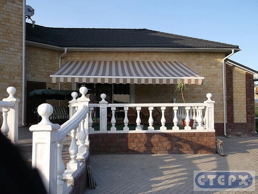 Фотография: Маркиза «Атлет-Гранд» оснащенная датчиком колебаний «Eolis 3D WireFree RTS» фирмы «SOMFY» над террасой усадьбы в поселке Дубовое.