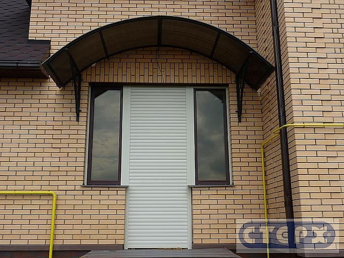 Скрытый монтаж рольставней на входной группе в коттедж. На фото: двери закрыты, а окна по бокам двери - открыты.