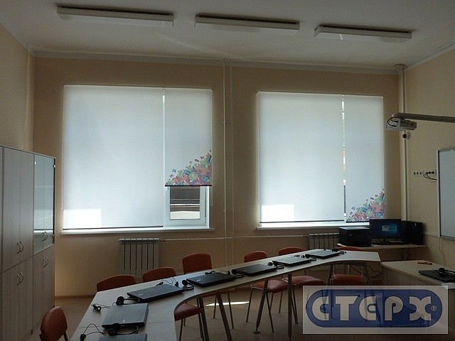 Средняя общеобразовательная школа № 101 в городе Воронеж. Рулонные шторы с рисунками по темам кабинетов. Фотопечать.