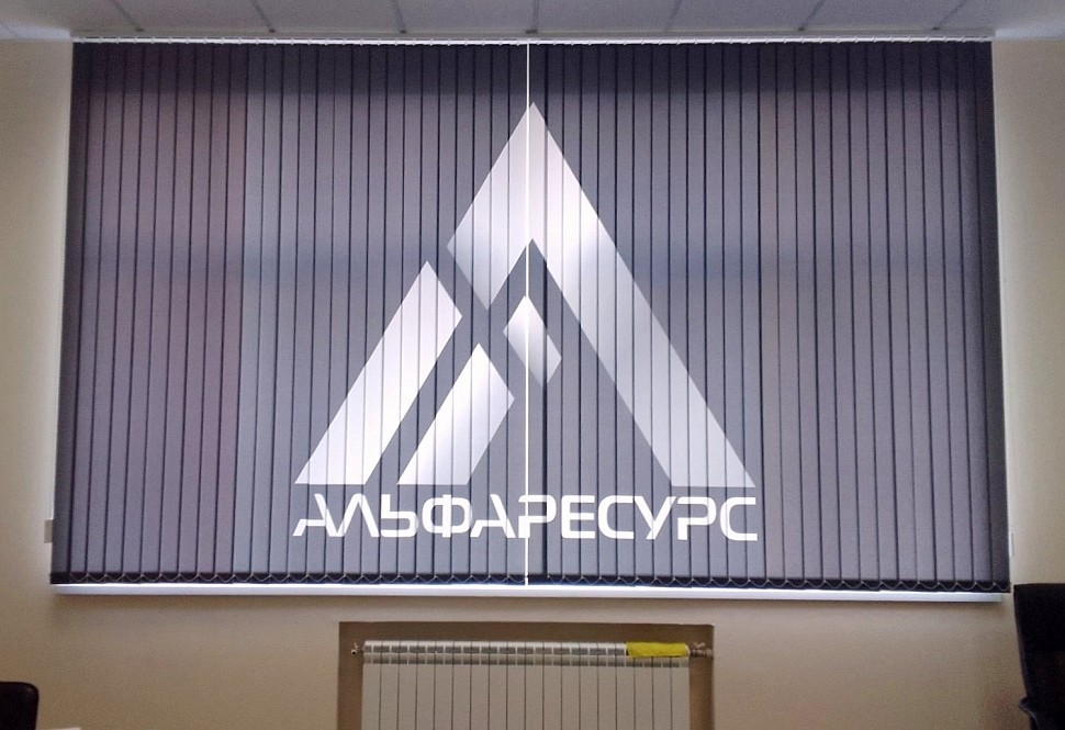 Жалюзи были выполнены по заказу компании Альфа Ресурс. Логотип компании заказчика сначала превратили в макет на вертикальных жалюзи, а затем распечатали на специальной ткани, нарезали ламели и соединили всё в готовое изделие