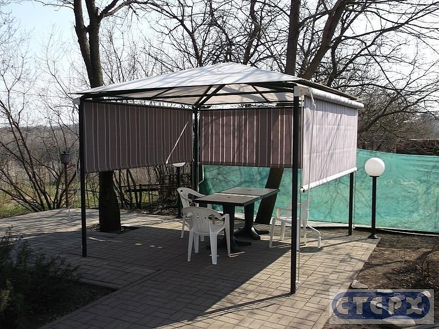 Фотография: Вертикальные маркизы на летней площадке кафе в поселке Новая Деревня Белгородского района Белгородской области. Маркизы полуопущены.